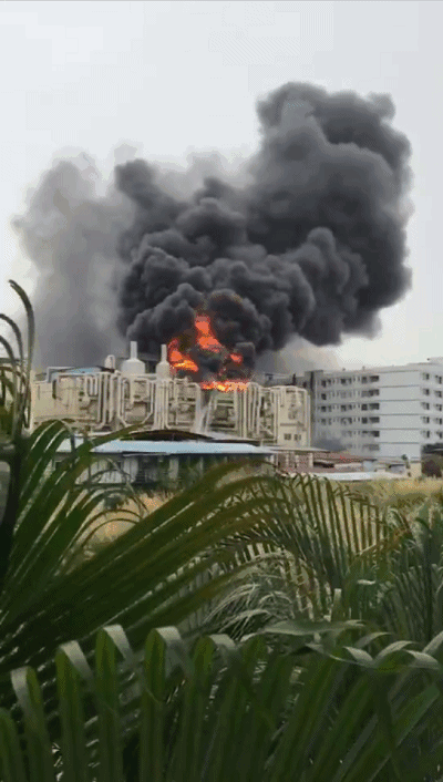 深圳宝安沙井的万安工业园发生火灾, 一栋大楼上燃起明火和大量浓烟,火势猛烈。